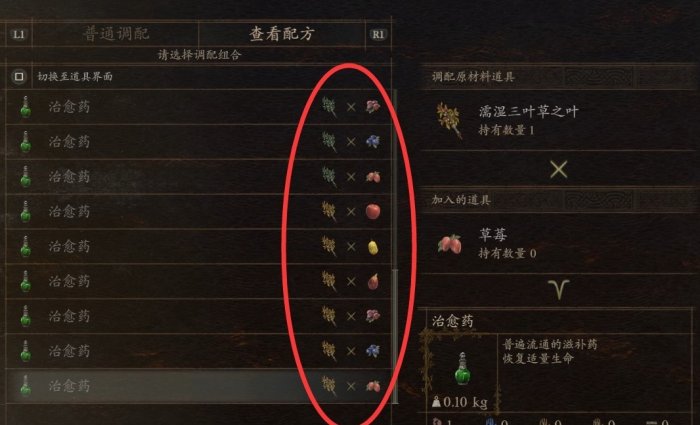 查看配方发现,多种水果和药草都可以合成治愈药。