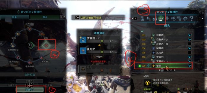 在任务中也可以快捷调和,需要设置登记快捷拦,并且狩猎过程中背包里有相应素材。如下图