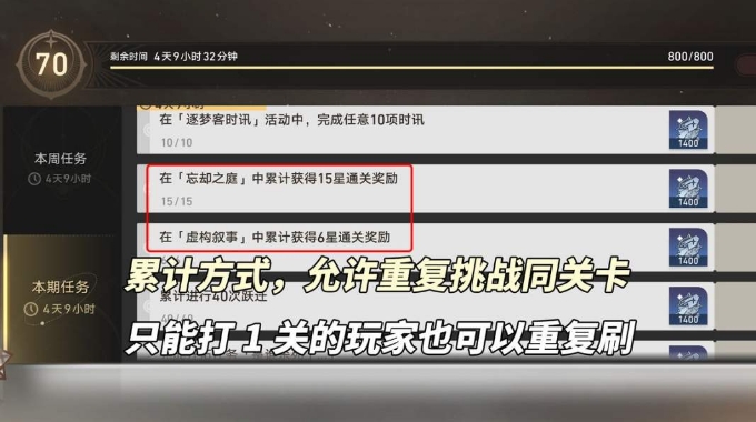 忘却之庭/虚构叙事所需星级,允许重复挑战关卡获取。也就是说,对于萌新开拓者,哪怕只能打过1关,也可以重复挑战,来完成任务。