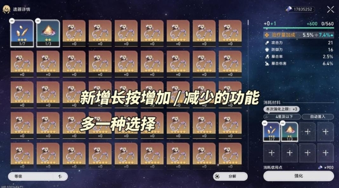 由1500提升至2000。看来开发组也有不少‘囤囤’玩家呀!虽说新添了5星遗器的快捷分解功能,可实际上仍有不少遗器哪怕词条抽象,大家也依旧不敢乱丢,生怕未来哪一天又香了。