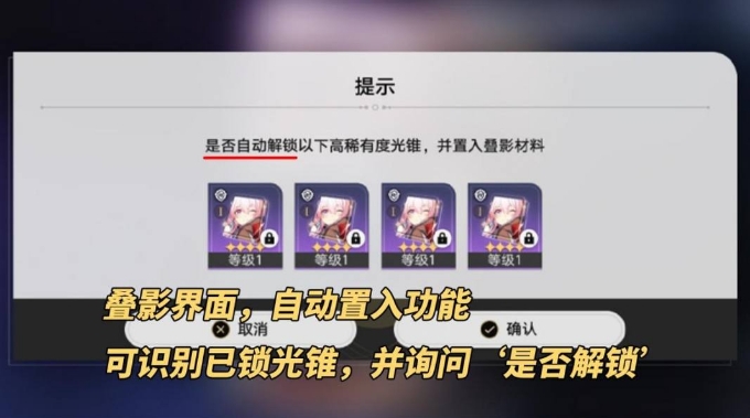 原先的判断逻辑太死板,由于4星、5星光锥自动锁定,一键叠影还需要开拓者先行解锁才能使用,不太智能。新优化,点击后会询问‘是否自动解锁以下光锥并叠影’,一步到位!