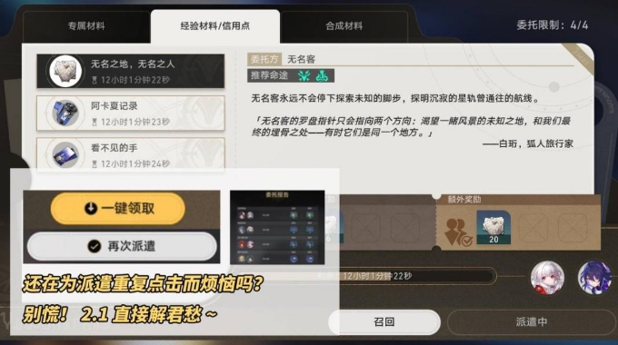 委托功能,对绝大部分开拓者来说,基本是一个月都难改变一次选项的功能。平时需要分8步进行,太抽象了!此次直接新增按钮,一键收取+重复派遣,省去原先无异于的行为。并且还在派遣页面显示此道具当前持有数量,方便分辨是否有必要更换派遣目标。