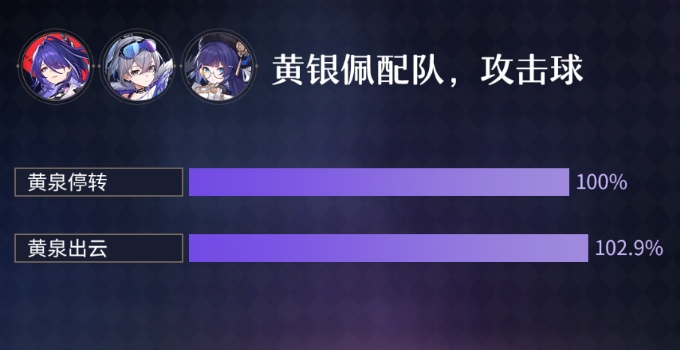 继续回到黄泉和出云套的适配度上来,黄泉本身行迹就要求队伍中拥有虚无命途的角色,和出云套的第二个效果几乎是不谋而合。无论是0星魂还是2星魂的黄泉,队伍中都至少有一个相同命途的角色,能够稳定触发暴击率的效果,适配度上无疑是拉满了。除了出云套以外,停转套也非常适合终结技伤害占比较高的黄泉,所以在计算伤害提升时,以这两套为主。