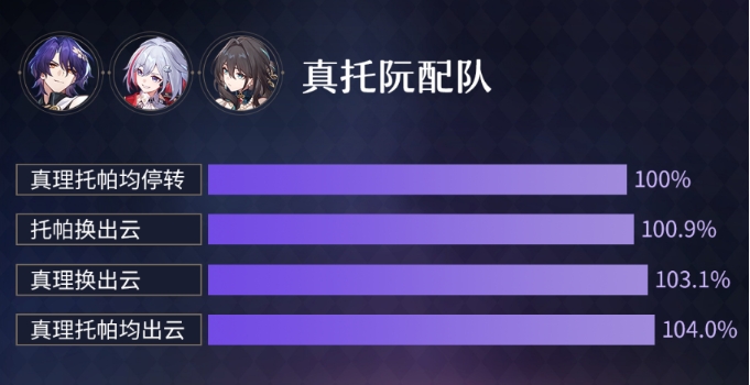 可以看到真托队将停转套替换为出云套之后,单人情况下托帕的伤害提升为1%,真理的伤害提升为2.2%,组队情况下托帕的伤害提升为3%,真理的伤害提升为4.4%。