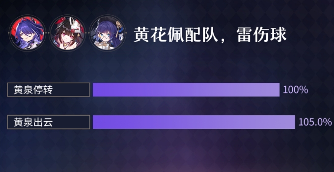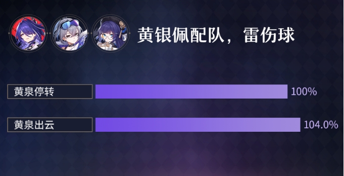 攻击球黄泉将停转套替换为出云套之后,单人情况下伤害提高了2.9%;雷伤球黄泉因为增伤区更多,提升在4.1%。而组队的情况,由于佩拉和银狼提供的是抗性区和防御区的加成,其他乘区没有改变,唯一影响的只有抗性区提升带来的一点点稀释,差距只有0.02%,几乎可以忽略不计。