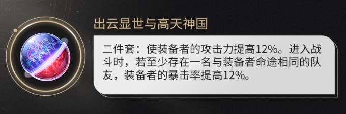 首先来看一下出云显世与高天神国套装的效果(以下简称出云套),第一条是常驻的12%攻击力,和苍穹战线格拉默以及太空封印站相同,重要的是第二条,队伍中有至少一个命途相同的队友可以提高12%暴击率。