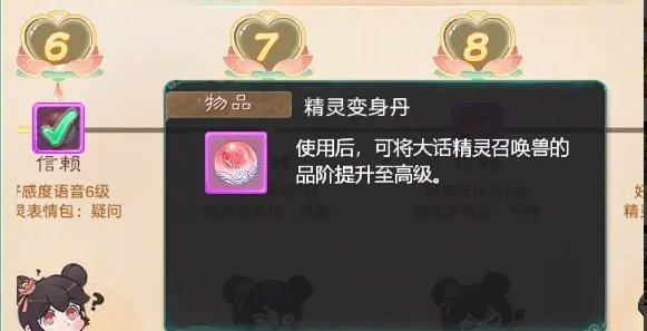 4、大约5天,好感度等级来到6级,领取“精灵变身丹”,成长为6开的大精灵,继续明雷或万兽园开5格,后领取10个聚魄丹开六格。