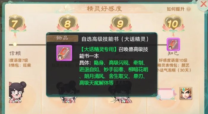 5、通过一直培养,预测一个月后好感度会达到10级,这时候就可以选择任意两本高级技能书了(包括隐身高闪),并且还会领取一张专属技能保护券,100%的成功率把技能打上去(先不保护打一个,再使用保护打另一个高级)。