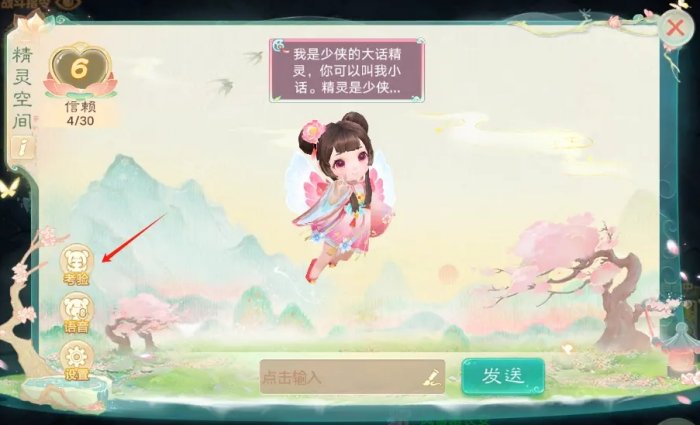 2、“精灵空间”左下角有“考验”按钮,完成后会获得好感度。