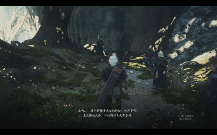 3、找到他后,他带领我前往了精灵村落,此处若带了会精灵语的随从,他会夸赞你,如下图