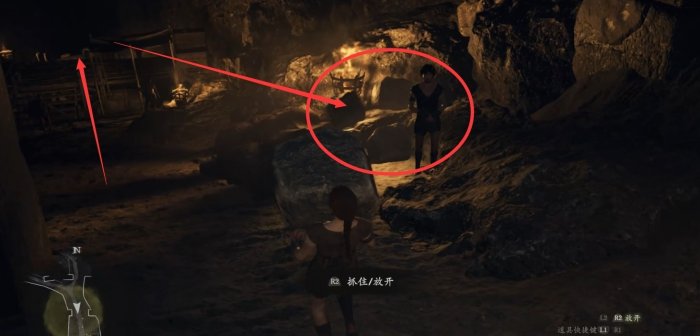 到洞里抱块石头出来,放到卢克身旁。这是抓取能力的教学,小怪或物体可以用抓取能力抱起来扔出去,大怪可以用抓取能力爬到它身上去。