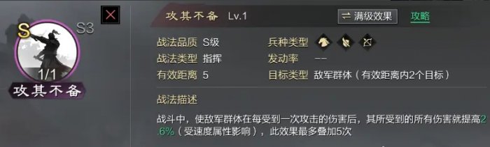 菜刀的绝对核心战法,几乎和追击这一体系挂钩,满级的高额增伤不弱于神兵大赏。包括现在主流的赞刀,撸铁都及其需要攻其不备这一稀有战法。没有攻其不备会使这一系列队伍的实力直接由t0掉到边角料队。
