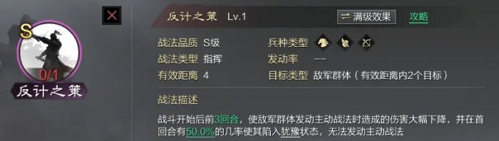 与战必同为老牌强力战法,适配于所有队伍,叹息与战必反计只能给一个,对所有主动武将都有极大的克制,开荒虽然不如战必,但是带反计的队伍克制面比较广。