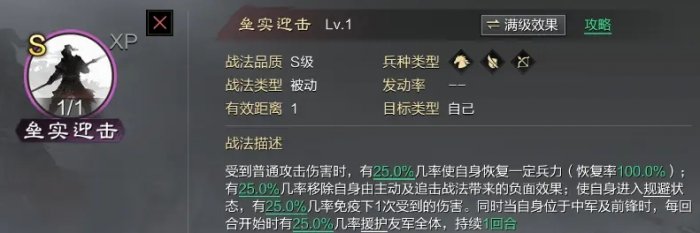 征服赛季肉队的绝对核心战法,可以说你的肉队没有垒实实力将大大下降,集规避恢复援护解控于一身的超模战法,大大加强前锋的生存能力,由于全面,甚至不用担心偶尔的战法冲突,是肉队前排必备战法,其他队伍前锋拥有垒实也可大大提高生存率。前锋武将:主公大大吧垒石给我吧。