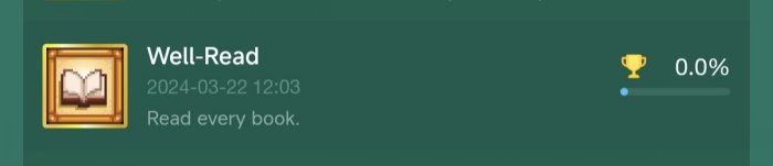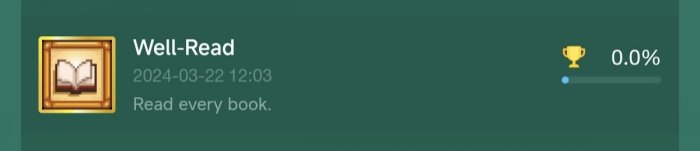 这个成就达成起来也没有什么难度,主要就是费时,技能书的获取方式本人目前已知的有打怪,钓鱼,做任务,书店。不过达成这个任务最方便的还是去刷书店,就是费点时间,没有注意点