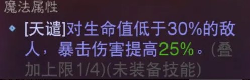 其次天谴对于30%血量下的敌人暴击提升25%,叠加4次就是100%暴击了