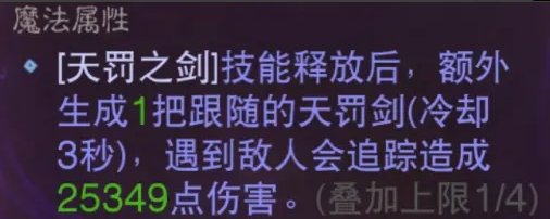 释放天罚之剑后,额外生成1把跟随的天罚剑,遇到敌人会追踪攻击敌人。