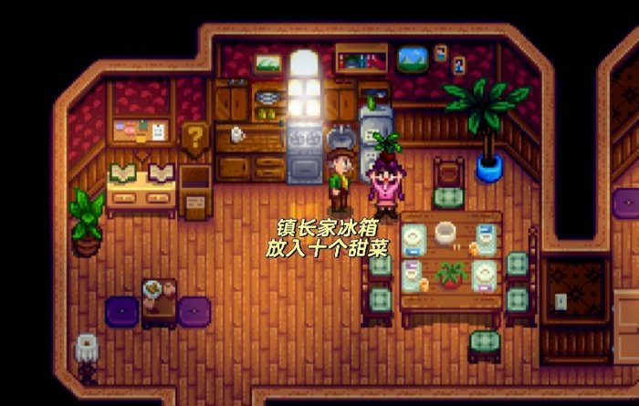 把十个甜菜(种子在沙漠绿洲商店购买,秋季6天长成)放入镇长刘易斯家的冰箱中。