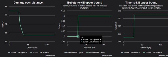 波顿的最大优势在于830rpm的超高射速,而且后坐不大非常容易压枪,加上28m内5枪死,在28m内理论ttk289ms。28m外需要6枪,理论ttk361ms。不难看出12m~28m是波顿的绝对优势距离(12m内是冲锋枪与霰弹枪占绝对优势)。实际使用时作战范围大概在40m,出了50m就不容易命中敌人了。这把枪在对枪的时候很有优势,因为可以轻易的把子弹压到一个位置,而且后坐力有时会导致瞄身体打头,非常舒适。