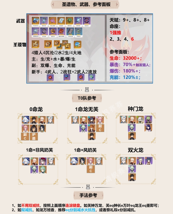 通过词条武器搭配出合适面板:3.2w+生命、70%+暴击(触发猎人)、120%左右充能、尽可能高的爆伤;