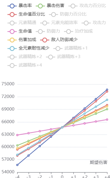 可以看到,x轴是按副词条计算,+4个暴击伤害词条,收益都不如+4个生命值百分比词条的收益高