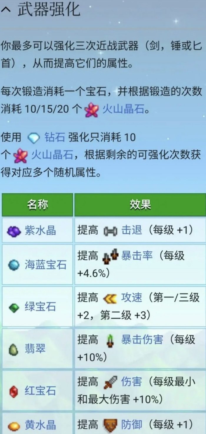 锻造台可以用五种水晶,翡翠和钻石加上火山晶石给武器强化,也可以用五彩碎片加火山晶石给武器和工具附魔。