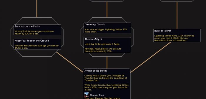 雷霆打击:盾牌猛击和嗜血有20%几率使你获得雷霆打击效果,可叠加两层。雷霆打击会替换你的下一个雷霆一击,并造成风暴伤害。