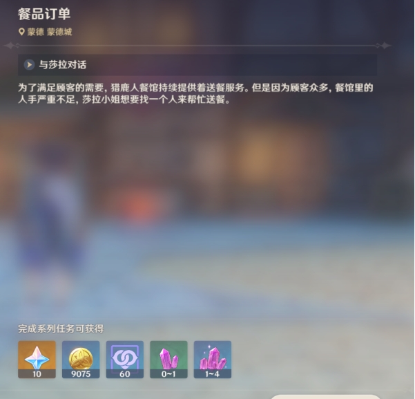 需要在蒙德接取到每日委托:餐品订单,接取送外卖委托后会给一份餐品,这个时候不要去送外卖,打开背包把这份餐品吃掉就可以解锁成就了。