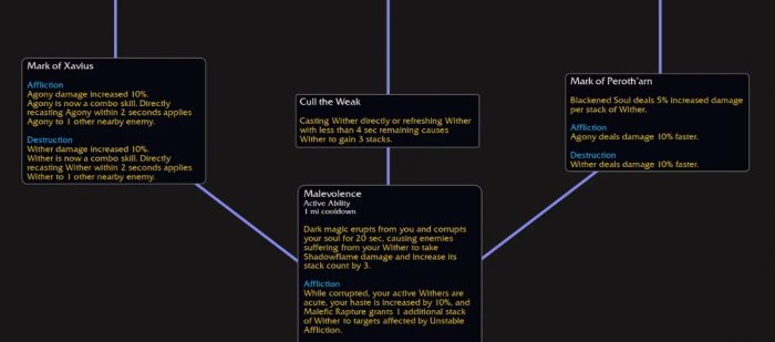 枯萎:替代腐蚀术(痛苦)、献祭(毁灭)。在目标身上施加一个邪恶诅咒,燃烧宿主肌骨,在18秒内造成暗影烈焰伤害。