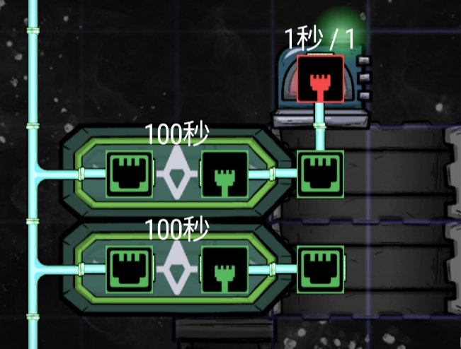 其次是太空扫描仪顶部的夹浮土机械门。当流星雨过去,太空扫描仪输出红色信号经过非门变成绿色信号,此时地堡门缓缓打开。40秒后地堡门打开,浮土掉落,我们不希望浮土掉到扫描仪上,所以此时应保持机械门关闭。使用过滤门设置为100秒,即接收到持续100秒的绿色信号才输出绿色信号打开机械气闸。地堡门打开后还需60秒机械气闸才会打开,此时上方的机械气闸会在时间传感器的作用下高频打开又关闭,把掉落的浮土吃掉,最后保持开启状态,扫描仪继续工作。