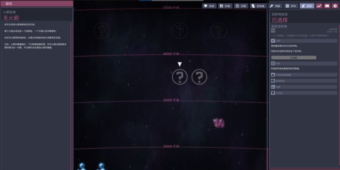 全部造好之后通入氧气就可以使用望远镜了,按Z打开星图(右上角也有),可以看到如下图所示的面板,其中“?”就是还没分析的星球,点右下角分析对象小人就会开始分析了。星图只能从下往上逐步分析,最后一层在180000千米处,也就是18层,越远的分析越久。分析完毕的星球就可以作为火箭的目的地啦。
