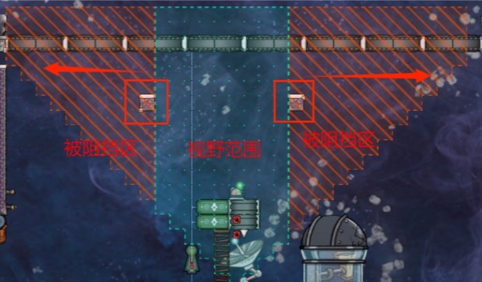 值得注意的是,如果雷达上方被不透明方块阻挡,不仅是该方块所在位置被阻挡,而是从该方块起往左/右整个范围都被判定为被阻挡,如下图所示。