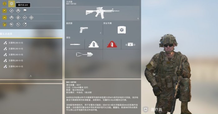 第二名医疗同样使用m4步枪,但不同在于使用了m150镜,以及相比前者失去了手榴弹和望远镜,以及一个备用弹夹,但是更建议新手使用第二位医疗,毕竟高倍镜实在太香了