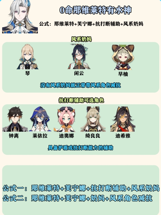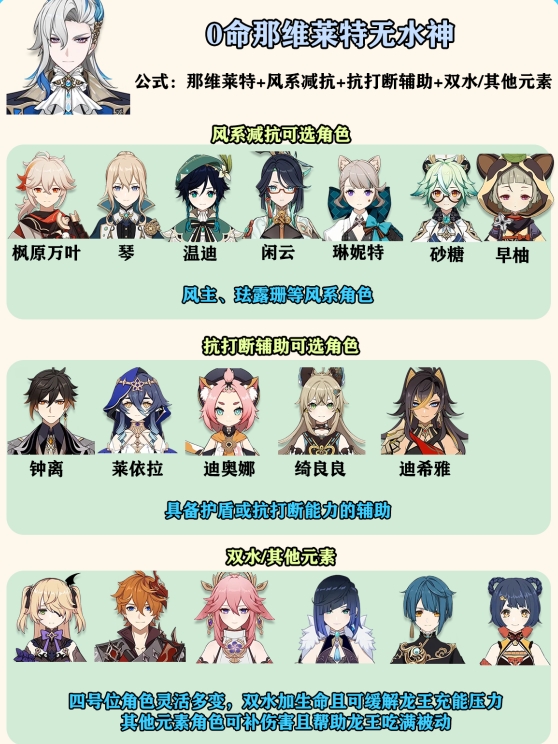 0命那维莱特没有水神:那维莱特+风系减抗+抗打断辅助+双水/其他元素