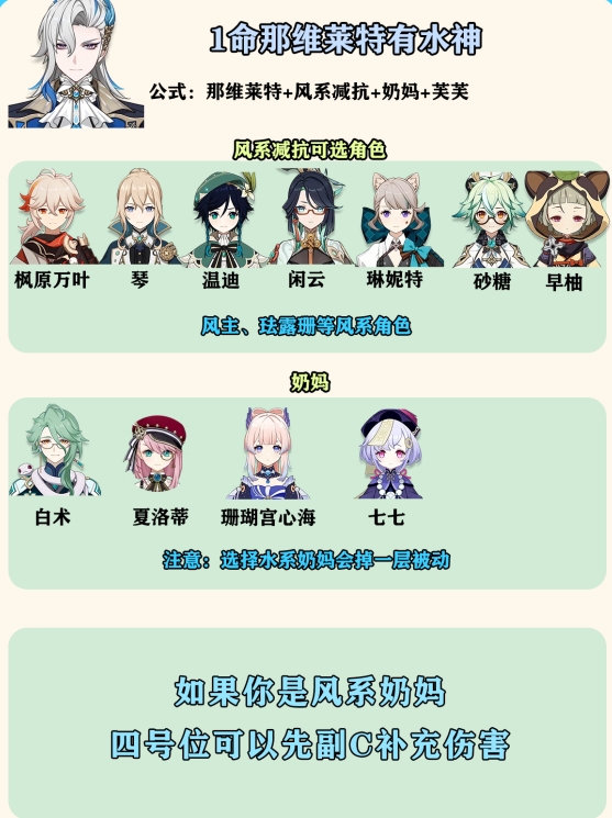 1命那维莱特有水神:那维莱特+风系减抗+奶妈+芙芙