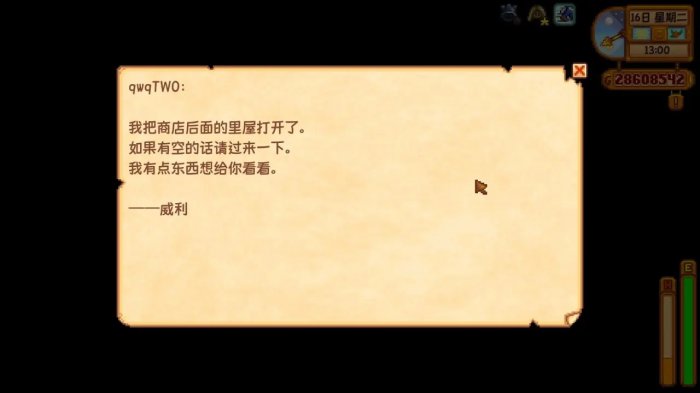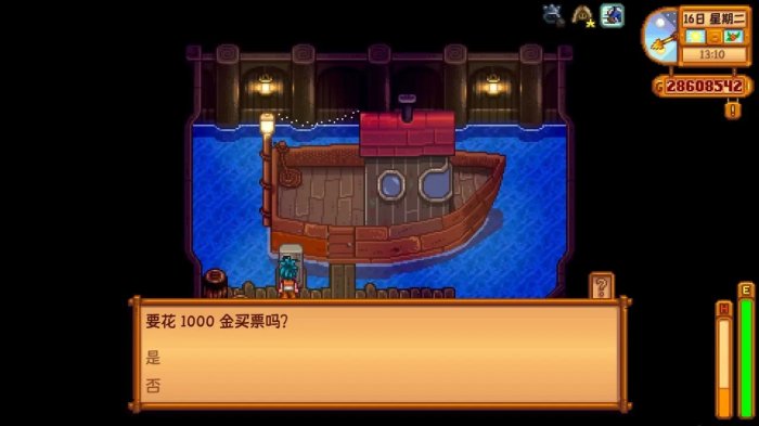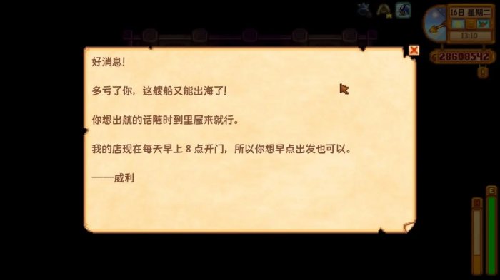 我们进去后,就会看到一艘破烂的船,威利就会让我们给他找材料修船,修船所需的材料为200硬木,5个电池组,5个铱锭,当我们交付后,当天夜里的晚上就会触发威利与罗宾修船剧情(睡觉触发),第二天再读威利的信,就可以得知船修好了,而且威利商店变成了早上8点开门,这时我们就能出发前往姜岛了,往返一次需要1000元