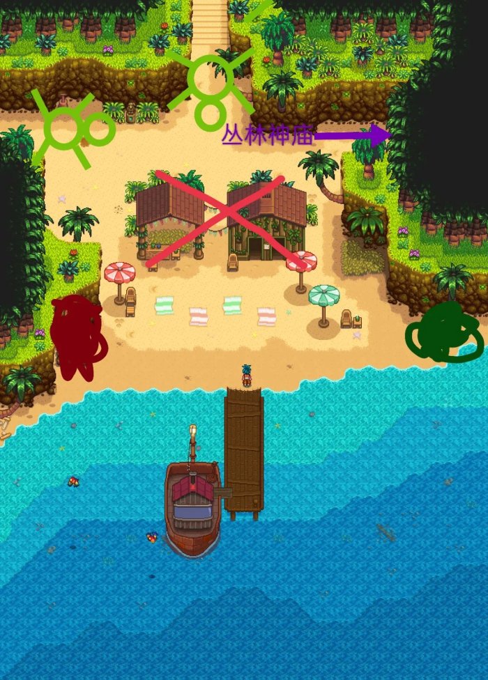 无论我们是坐船来,还是传送来,初始地都会在这里,当新手第一次来的时候,西部区域与北部区域的入口是会有乌龟挡路的,中间的度假村和鹦鹉特快(红色涂掉那块)是一片废墟,需要金核桃修复,东南部区域的入口是堵住的,只有右边的丛林神庙入口可以进入,如图所示