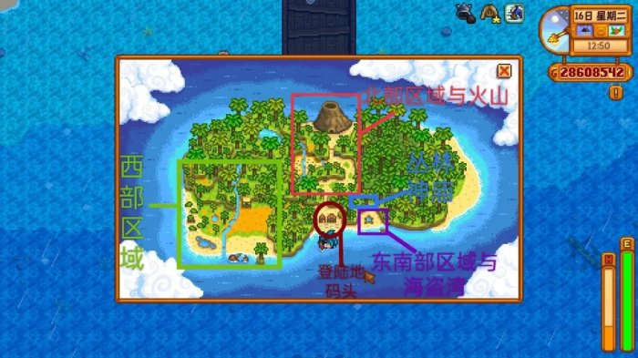 姜岛是1.5更新的大地图,位于鹈鹕镇海滩的南方,是一座海上的小岛,当我们完成献祭或joja超市线后的第二天,威利就会写信给我们,让我们去他的里屋看看(里屋就是威利商店里面的那扇门)