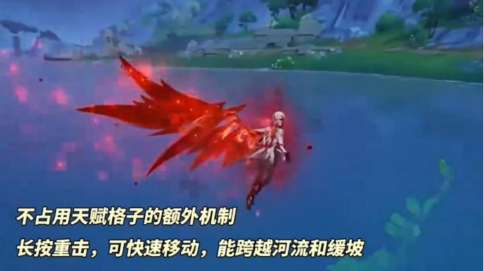 持续长按重击,会进入快速移动状态。从呈现的状态来看,应该与那维莱特是相似机制,脚底浮空,可跨越河流以及快速攀登缓坡,但移动速度更快些。这种额外机制也不占用天赋,在实战转移战场或大世界部分地形有用,挺好的。