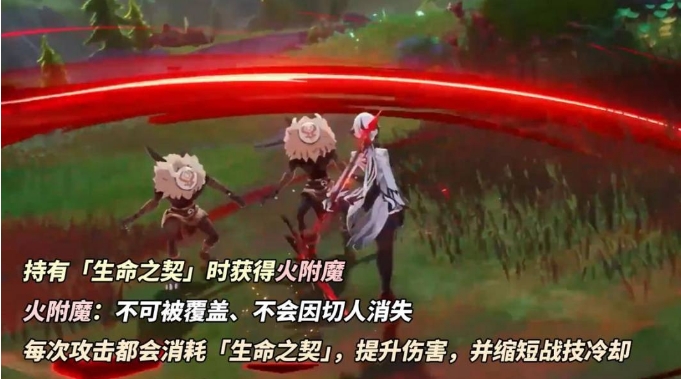 当阿蕾奇诺身上持有「生命之契」时,普通攻击、重击与下落攻击将转化为无法被附魔覆盖的火元素伤害,并会在每次普通攻击命中敌人时,消耗「生命之契」来提升攻击伤害,并缩短战技冷却。由于「生命之契」不会因为切换角色而消失,意味着仆人的火附魔可以用来前置挂火扩散,配队和输出轴也会更自由些~