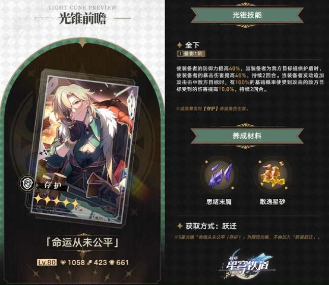 砂金的专属光锥,提供最高档位的661基础防御,比此前基础防御最高的杰哥专锥更高,并且生命面板也是比较常规的1058档位,能使砂金作为存护角色拥有合格的抗伤能力,同时也提高了砂金的大防御词条收益。