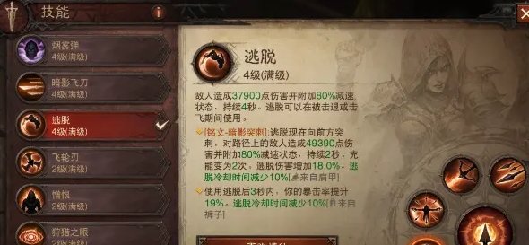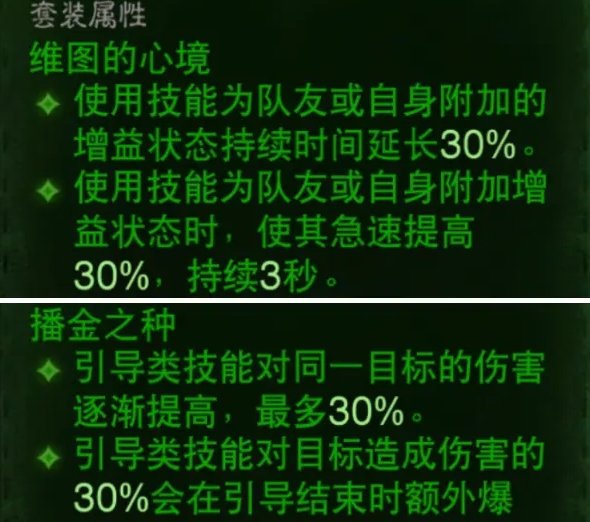 以力破禁的暴击加成精华不吃维图,吃增益时间的收益,测试拿下维图和装备维图都是4秒持续时间。个人觉得猎魔人还是需要一个位移技能哪怕是日常跑图也会舒服很多,如果你放弃逃脱可以考虑带绳索射击加速,BD如图:
