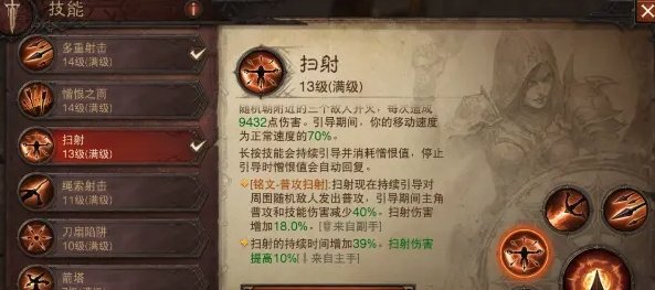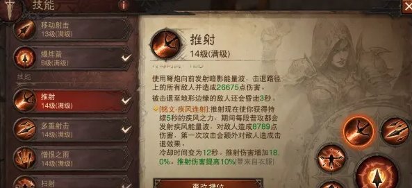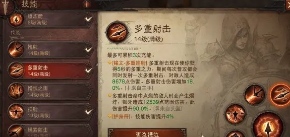 首先技能我们选择带扫射+推射+多重射击,多重射击变成BUFF技能搭配爆炸箭全程点燃头部精华可以一直爆炸范围输出,那么搭配推射就可以做到全程风火助威了。扫射是用来爆发的,利用增加扫射时间提高爆发时长,输出更猛。护肩以力破禁还是必带,裤子可以带“滑板鞋”增加暴击,个人觉得猎魔人还是需要一个位移技能,有极端玩家想不带“滑板鞋”是不推荐的。