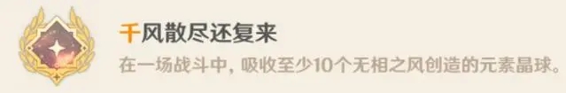 在一场战斗中,吸收至少10个无相之风创造的元素晶球。需要在击败无相之风前吃到无相之风产出的十个风球即可解锁成就。