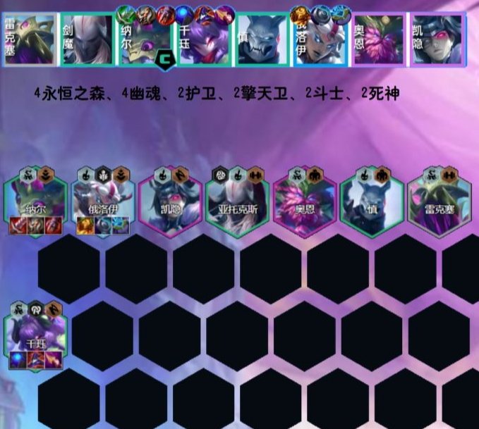 8人口补凯隐开出4幽魂2死神,然后大刷一波,将凯隐和奥恩搜出两星。如果有永恒之森转职,就尽快上9补阿兹尔开出6永恒之森。没转职就在8人口追其他三星,或者上9补丽桑卓。