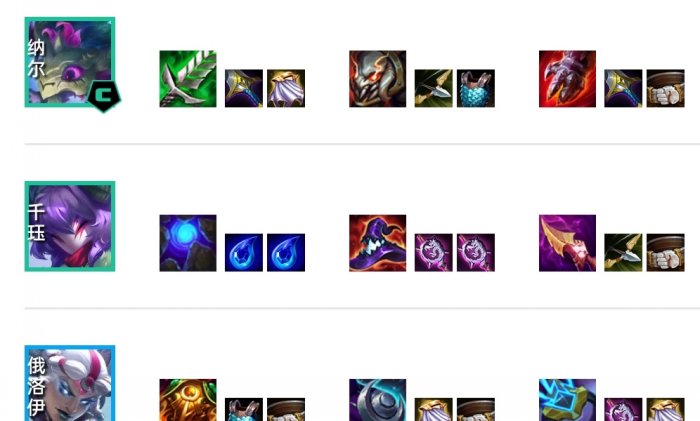 俄洛伊带功能装。日炎斗篷给对方挂上重伤效果和持续灼烧伤害。薄暮法袍减敌方护甲,提升纳尔的输出。离子火花减敌方魔抗,提升千珏的输出。