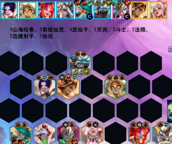 3山海绘卷、3剪纸仙灵、3武仙子、2天将、2斗士、2法师、2迅捷射手、1仙侣。