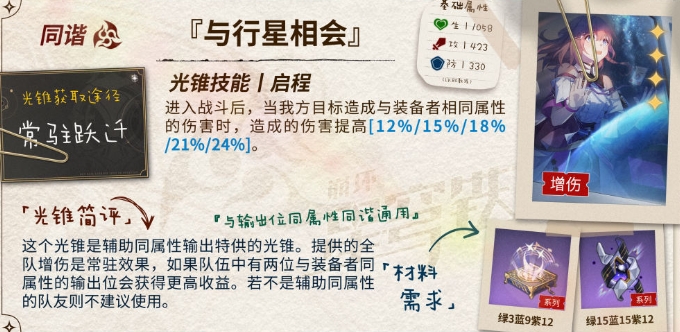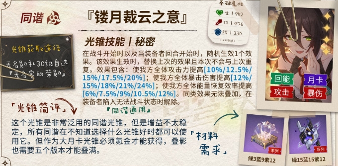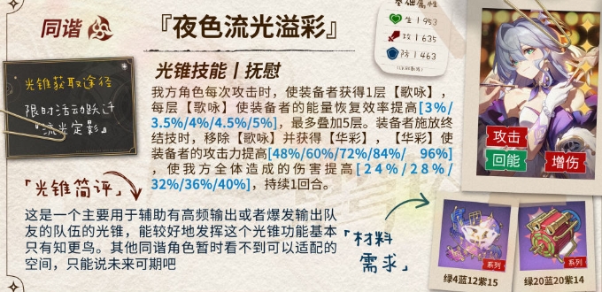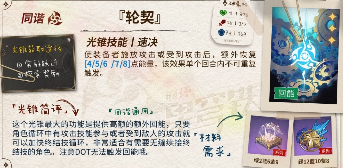整体来说,这个光锥是贴合知更鸟的机制的,输出增益部分给的还算挺高,而充能部分会更适合队友攻击频率较高的队伍。