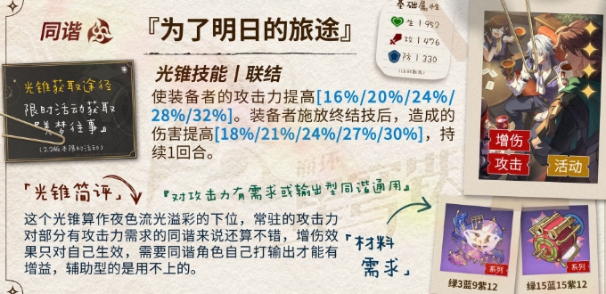 这个光锥是活动光锥,活动期间可以免费获得满叠影。提供攻击力加成和终结技后增伤,虽然持续时间不长,但是契合知更鸟的机制的,能够提高知更鸟的伤害,以及终结技的攻击加成转化数值。是偏输出向的光锥,在循环上就没有增益了。