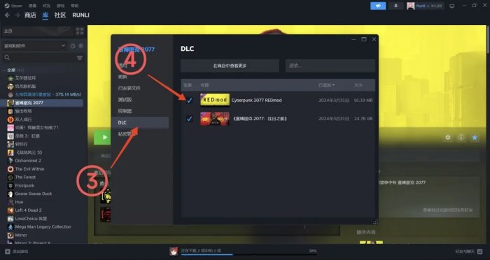在DLC一栏中勾选Cyberpunk 2077 REDmod(这里找不到的话请在steam商店搜索添加)